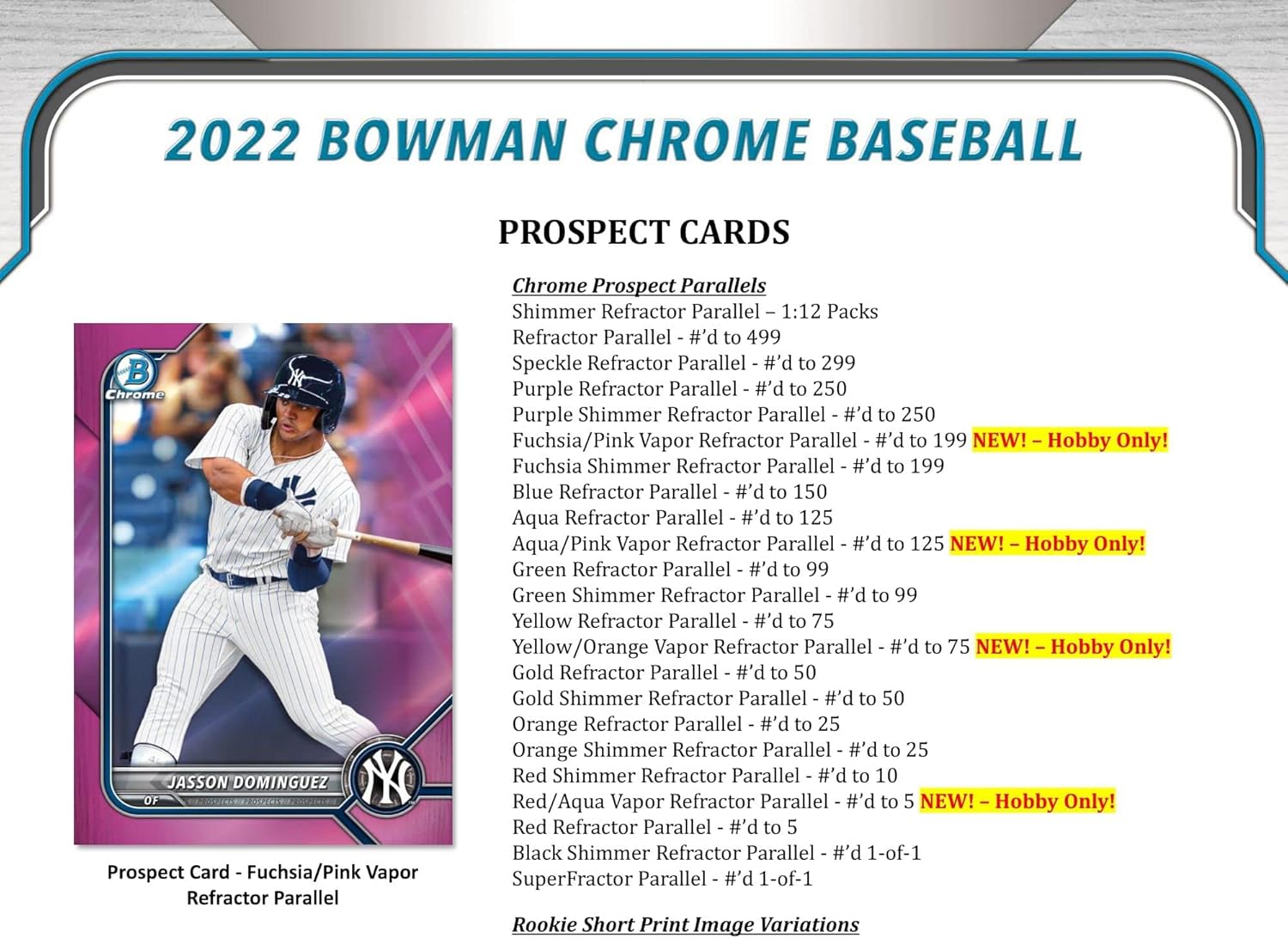 Each sealed box contains 12 packs (two 6-pack mini boxes) of 5 cards including ONE Autograph card per mini box. *Bowman Chrome builds on a reputation of being one of the most prolific products to find all the top international and domestic prospect talent, with another stellar release in 2022! *Look for 1st Bowman Cards of Anthony Gutierrez, Jarlin Susana, Michael Burrows, Yanquiel Fernandez, Mason Auer, Roderick Arias, Jaison Chourio, Cristhian Vaquero, Jorge Barrosa, Eddinson Paulino, Ricardo Cabrera, Enmanuel Valdez, Leonardo Balcazar, Yasser Mercedes, Jonathan Mejia, Danyer Cueva, Joey Wiemer, Yeison Morrobel, and Austin Schultz. *Build the entire 100-card Base Set and 100-card Chrome Prospect set featuring a stellar lineup of rookies, veterans, and top prospects from around the globe! *Look for SuperFractor Parallels numbered 1-of-1! Collect Rookie Short Print Image Variations! *Collect Bowman Ascensions with specially curated designs by the highly influential duo of artists at Invisible Creature! *Featuring Rookie Cards of Julio Rodriguez, Wander Franco, Bobby Witt Jr., and Spencer Torkelson!