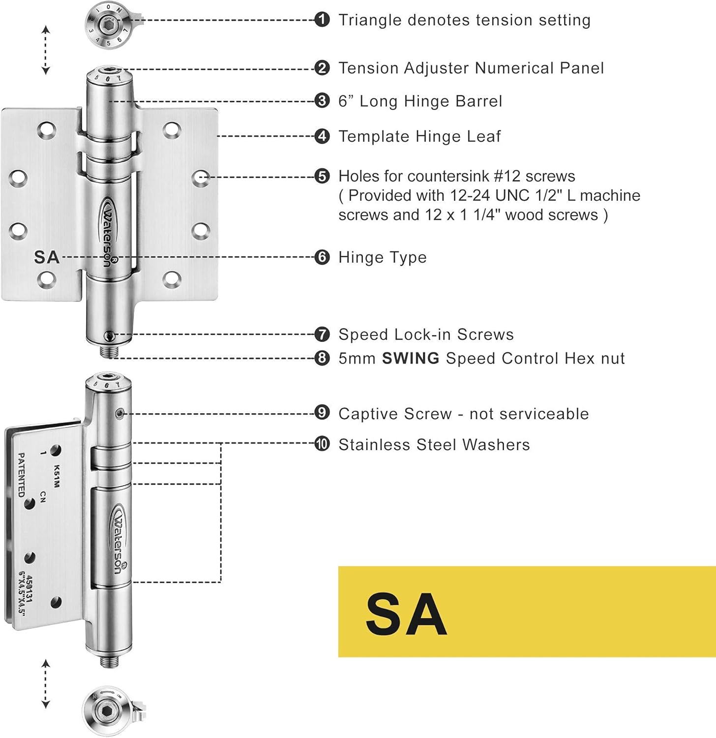 WATERSON Auto Door-Closer Hinge The Waterson hinge is a hybrid conventional door closer & spring hinge. It has a built-in tension adjuster with speed control, so no more slams! Suitable for interior & exterior openings. Easy installation with subtle balance between aesthetics & functionality. We guard your privacy behind doors, soothe the noises of slamming, & guarantee a comfortable dwelling environment. What’s the Difference Between Hydraulic & Mechanical Hinge Types? The difference between the two types defines how your door closes: Hydraulic (soft-closing) type: Soft-closing; the door specifically slows down in the hydraulic zone. Mechanical (self-closing) type: Self-closing; closing speed remains mostly average from swing to latch. Choosing The Right Hinge Type Scenarios where hydraulic & mechanical hinges are needed: Hydraulic: Room is mildly windy & you don’t want your door constantly slamming. Examples: Storefront , luxury apartment, high-end villa. Mechanical: Latching & self-closing are the only priority. No special speed adjustment needed; rapid temperature/humidity changes like outdoor environment. Examples: Five-star hotel. Why Should I Use A Closer Hinge? Our hinges are tested & proven. Over 1,000,000 cycles tested to provide the most durable hinge on the market, with over 20,000 installed. While there are other types of spring loaded & self closing hinges, Waterson is the only one that meets ADA requirements for pressure, speed, & latching, ensuring your door closes smoothly & safely, every time. Fewer pieces to install = less labor & lower total cost. Waterson Hinges are aesthetically appealing & less cluttered. Easier to install than concealed pivots & closers. Our hinges are great for all your door closing needs!
