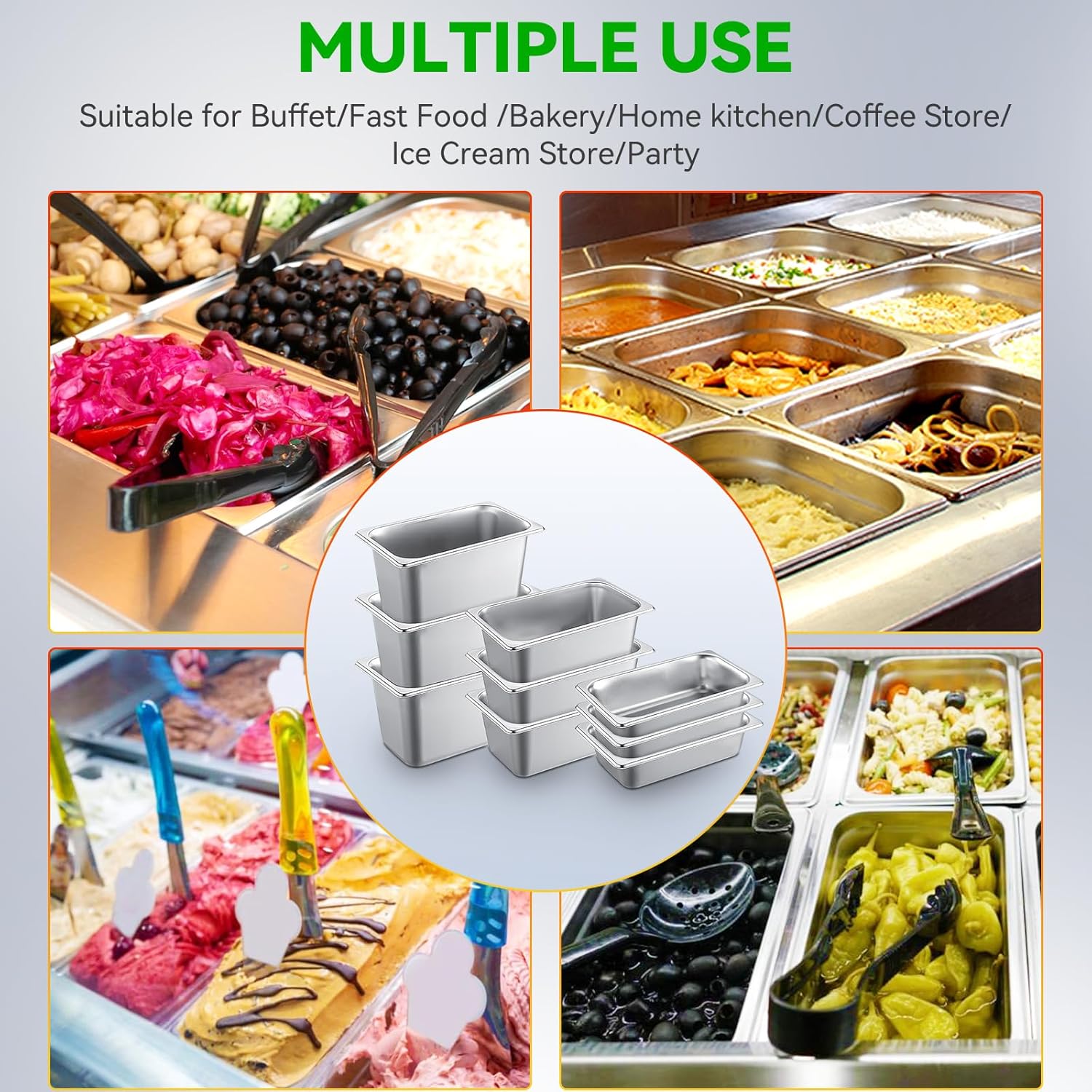 9 Pack 1/4-size stainless steel hotel pans—Each with its Own Lid.Made from durable, food-grade 201 stainless steel 🔩🔥oven-safe up to 500°F 🔥❄️freezer-safe down to 0°F❄️perfect for baking, chilling, storing, and serving.✅Bring your signature dish to a friend’s gathering—these 1/4 pans are perfect for sharing homemade food in style.✅Great for holiday parties, BBQs, and potlucks—keep your food organized, fresh, and ready to serve.✅Great for packing up meals to go—perfect for picnics, potlucks, or sending leftovers home with guests.✅Use them while baking pies, pizzas, cakes,muffins or taco to prep and organize ingredients like a pro.✅From Thanksgiving turkeys to Christmas sides—these hotel pans help keep holiday meals hot, fresh, and ready to serve.✅Store fresh greens and leftovers at home—these hotel pans fit perfectly in your fridge for easy food storage.✅Also ideal for commercial settings like buffet lines, restaurant kitchens, and hotel food service. 🏠👨🍳.Versatile, reliable, and ready for anything—your kitchen just got an upgrade! ⏫