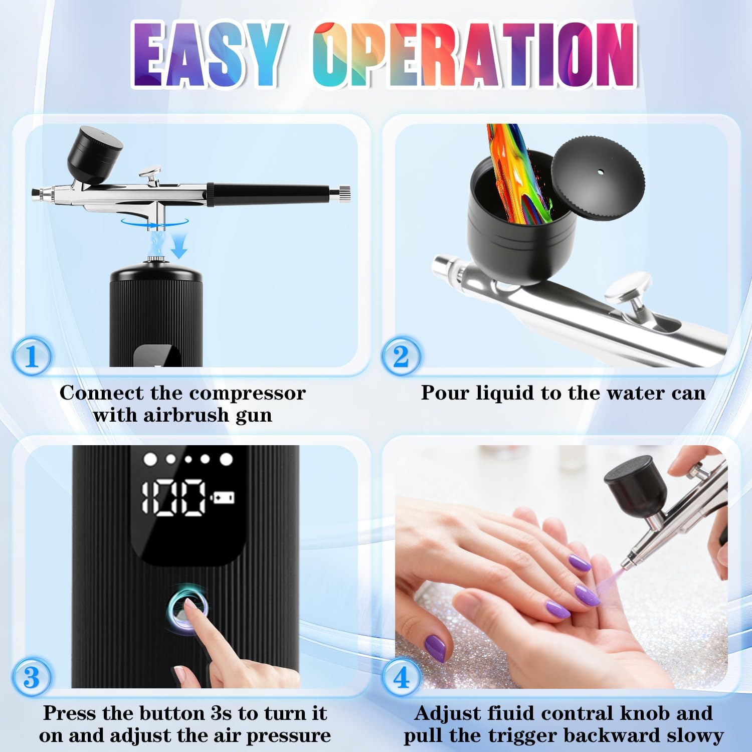 | Additional Features | 0.3mm Fluid Nozzle, 3-Gear Adjustable Air Pressure, Cordless, Portable, Two Connection Modes |