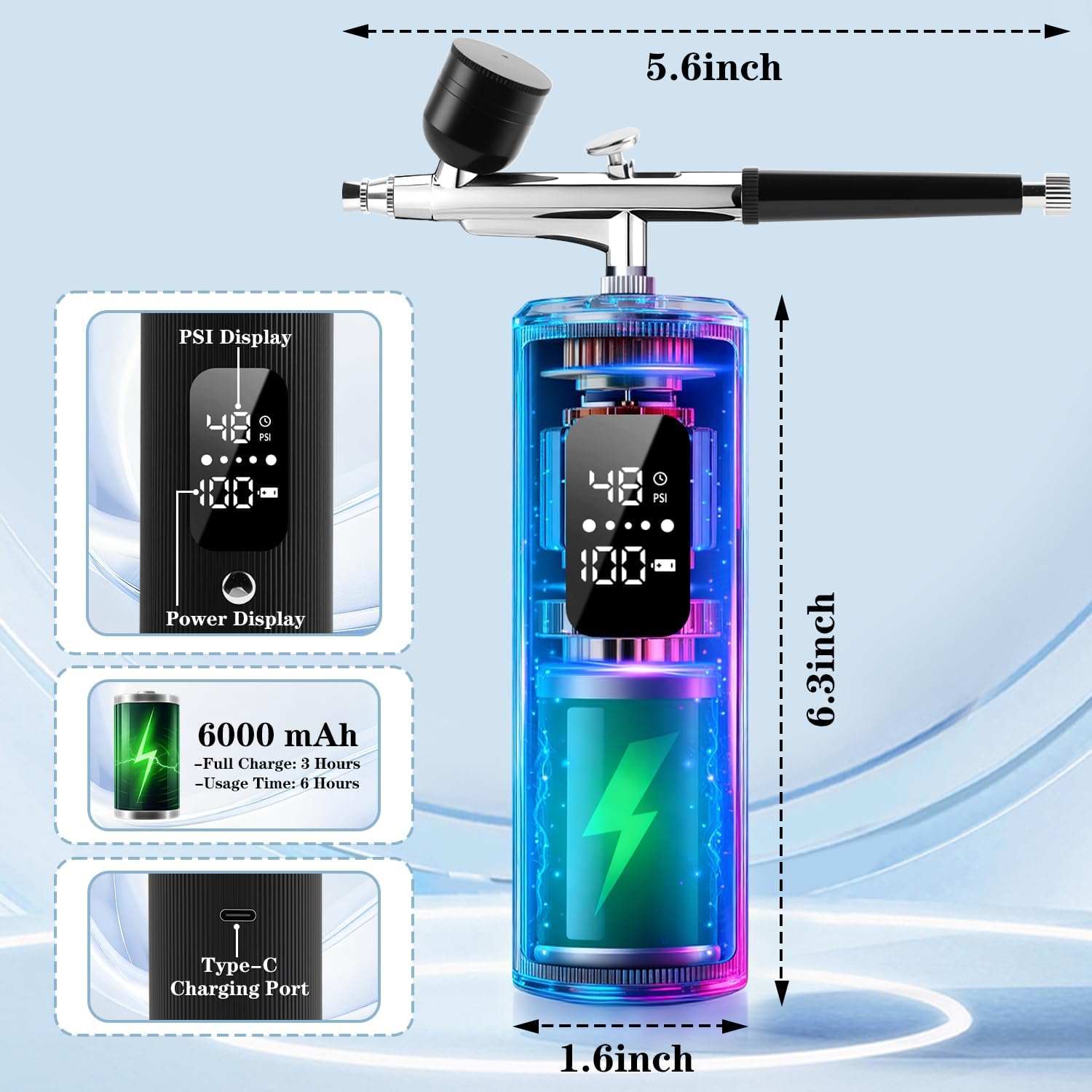 | Included Components | 2 0.3mm nozzles, 3 different-sized capacity cups, 4 paint brushes, Type C charging cable, airbrush gun, braided air hose, complete cleaning kit, gloves, portable air compressor |