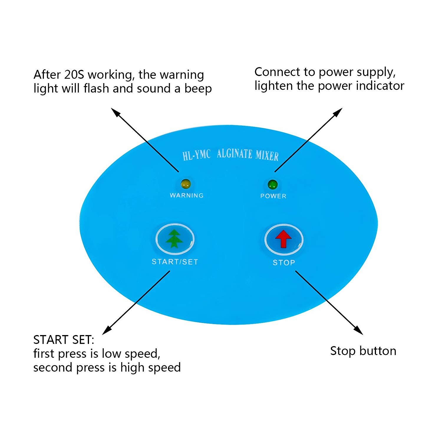 Main parameters of whole item: ①.Power supply: AC 220V±10%, 50 Hz±1Hz or AC 110V, 60Hz ②.Speed: low-speed: 120rpm, high-speed: 250rpm. ③.Regular alarm: After mixing 20S it will have beep sound and alarm light will flash to warn user using the alginate immediately, or it dries. ④.Stop working if overload: When the motor overloaded, the unit will stop working automatically after 3S, press Start key to working again. ⑤.Gross weight: 2.0 KG ⑥.Size: 280*230*230 mm Packing: Mixer Plastic knife Mixing bowl Fuse Manual
