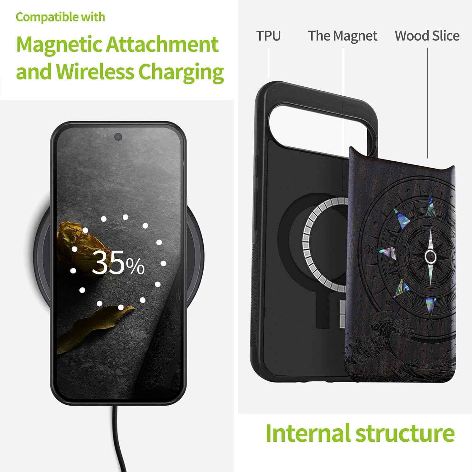 | Additional Features | Natural solid wood back panel and laser engraving, The unique solid wood keeps the palm dry and prevents fingerprints from sticking to the surface of the case, keeping it clean and elegant |