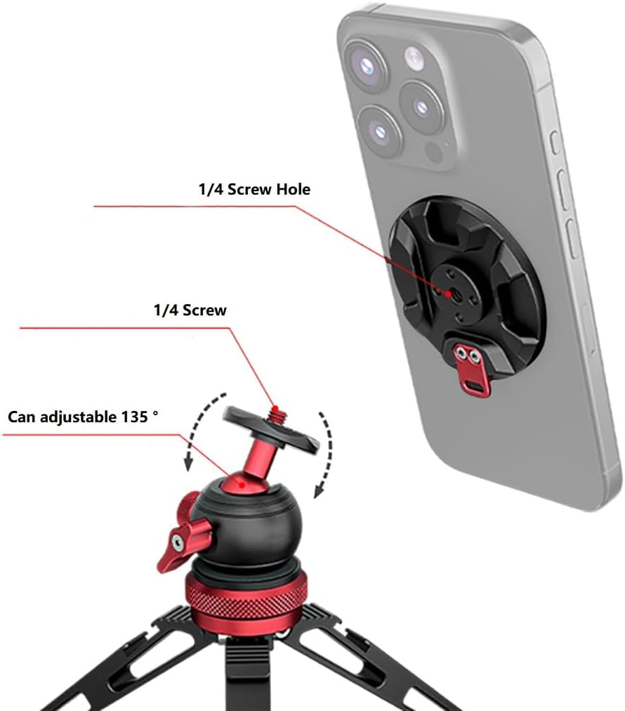 FEICHAO Magnetic Phone Base Cell Phone 1/4 Screw Hole Holder Tripod Mounting Bracket Compatible with iPhone 16 Magnetic Phone Description Magnetic BaseDiameter: 60mm Material: Aluminium alloy + PVC Screw holes: 1/4 screw holes Adaptability: Compatible with iPhone 12/13/14/15/16 full range of magnetic mobile phones, non-magnetic models can be used with a magnetic phone case or lead magnet ring. Mini Tripod: The bottom of the tripod is designed with high-performance rubber anti slip pads, which are not easy to move when placed. Tripod Set: With magnetic rotating ball head mount, the load capacity of 10kg, suitable for mobile phone/camera.