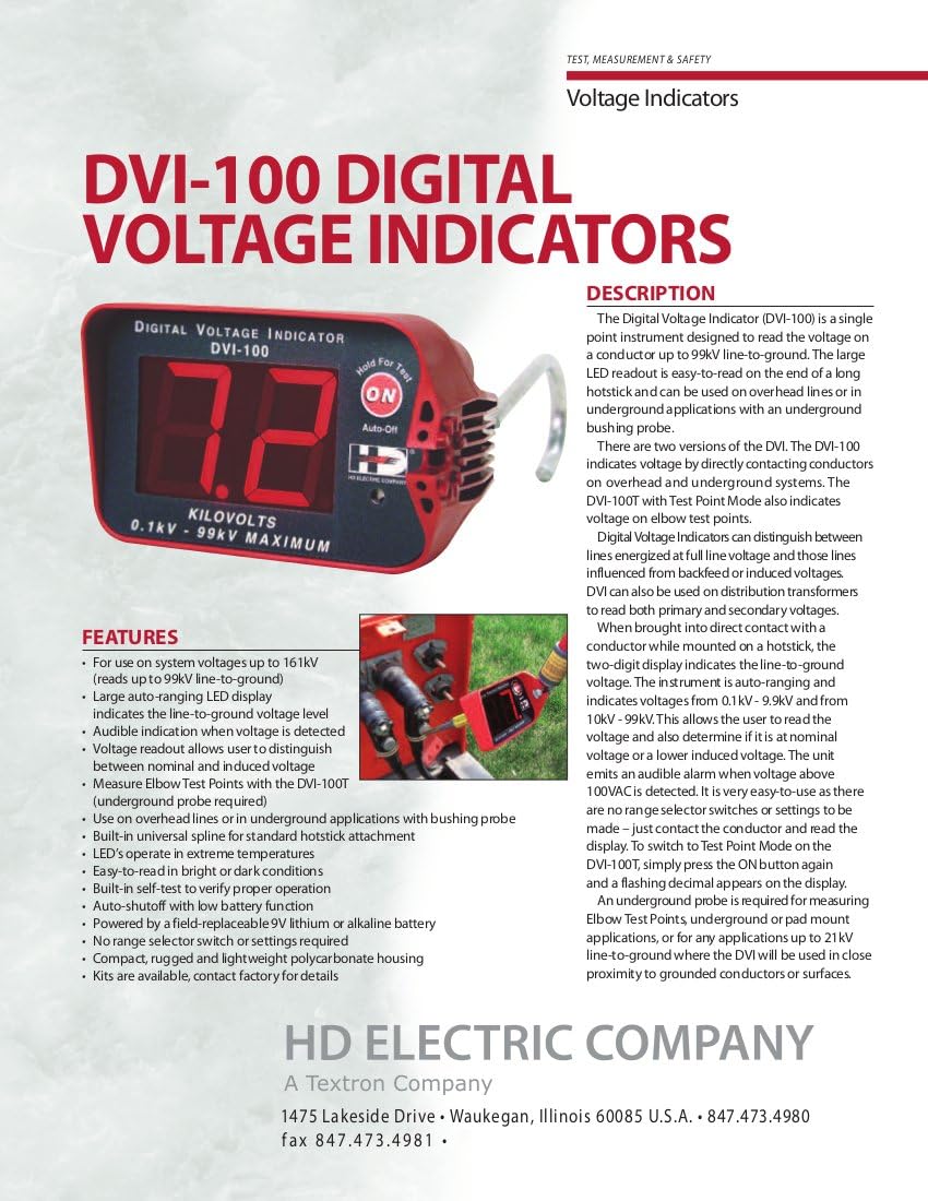 The digital voltage indicators) are single point Instruments designed to read the voltage on a conductor up to 500kV line-to-ground. The large LED readout is easy to read on the end of a long hot stick and can be used on overhead lines or in underground applications with an underground Bushing probe, sold separately. The DVI emit an audible alarm when voltage above 100VAC is detected. They are very easy to use as there are No range selector switches or settings to be made – just contact the conductor and read the display.