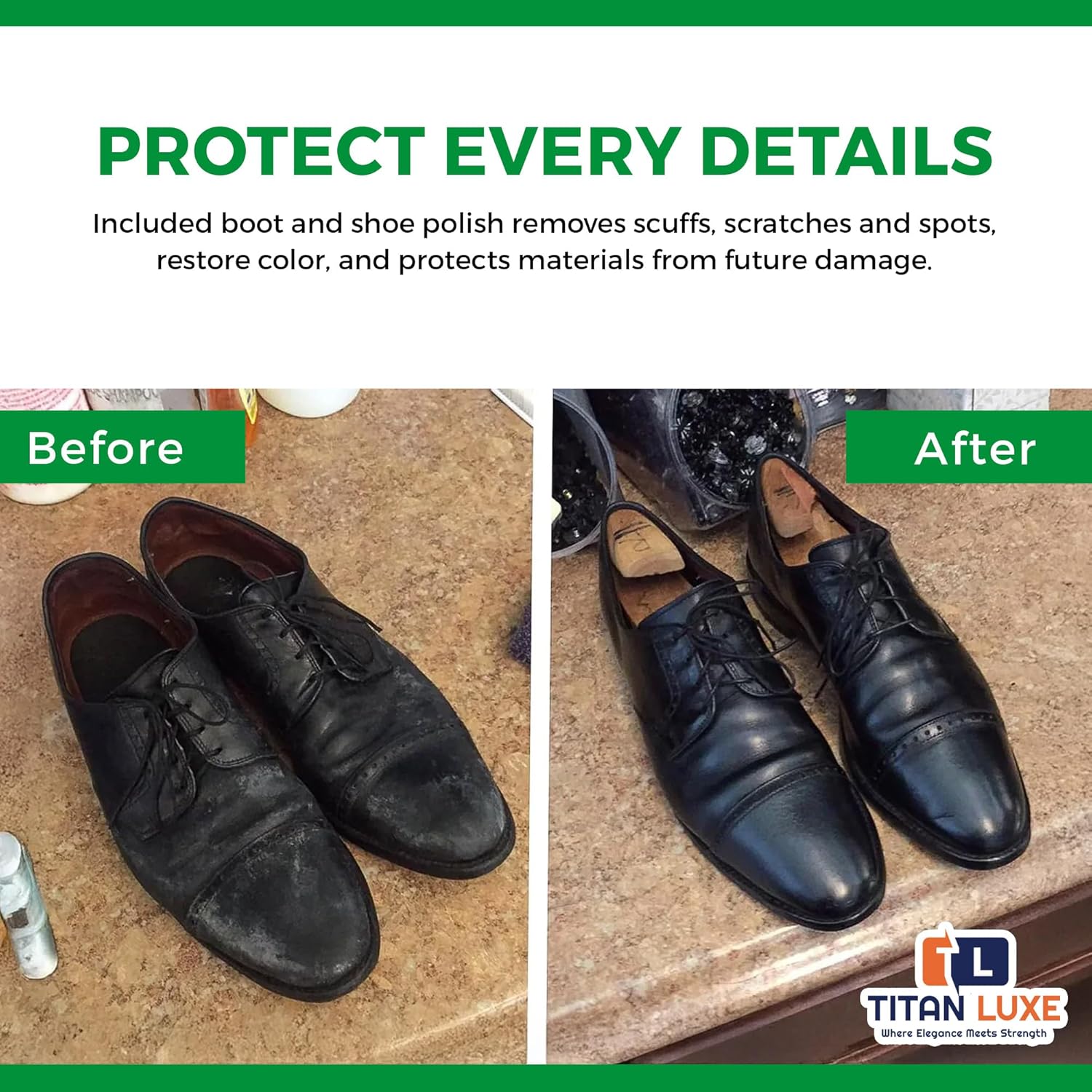 TITAN LUXE LEATHER LUSTER SHOE CLEANING KITBring dull, scuffed leather back to life with the TITAN LUXE Leather Luster High Gloss Finish Kit. Your all-in-one solution for achieving a long-lasting, mirror-like shine on boots, shoes, belts, holsters and saddles. Specially formulated for those who demand a professional grade appearance, this kit delivers a flawless, high gloss finish without the hassle of heating, buffing or polishing.Whether you're preparing for inspections, parades, duty or simply want to elevate the look of your favorite leather gear, our easy to use two step system cleans, restores and seals your leather with a fast drying, water resistant coating. It's trusted by military personnel, law enforcement officers and equestrian enthusiasts for its ability to transform worn leather into a sharp, commanding presence.Inside The Kit:One 4 oz can of Leather Luster high-gloss finish with built-in applicator One 4 oz can of Leather Luster pre-cleaner One Leather Luster steel wool padEverything needed for cleaning and finishing are added in this kit. No additional tools required.Get the shine that commands attention, choose TITAN LUXE Leather Luster Kit today.