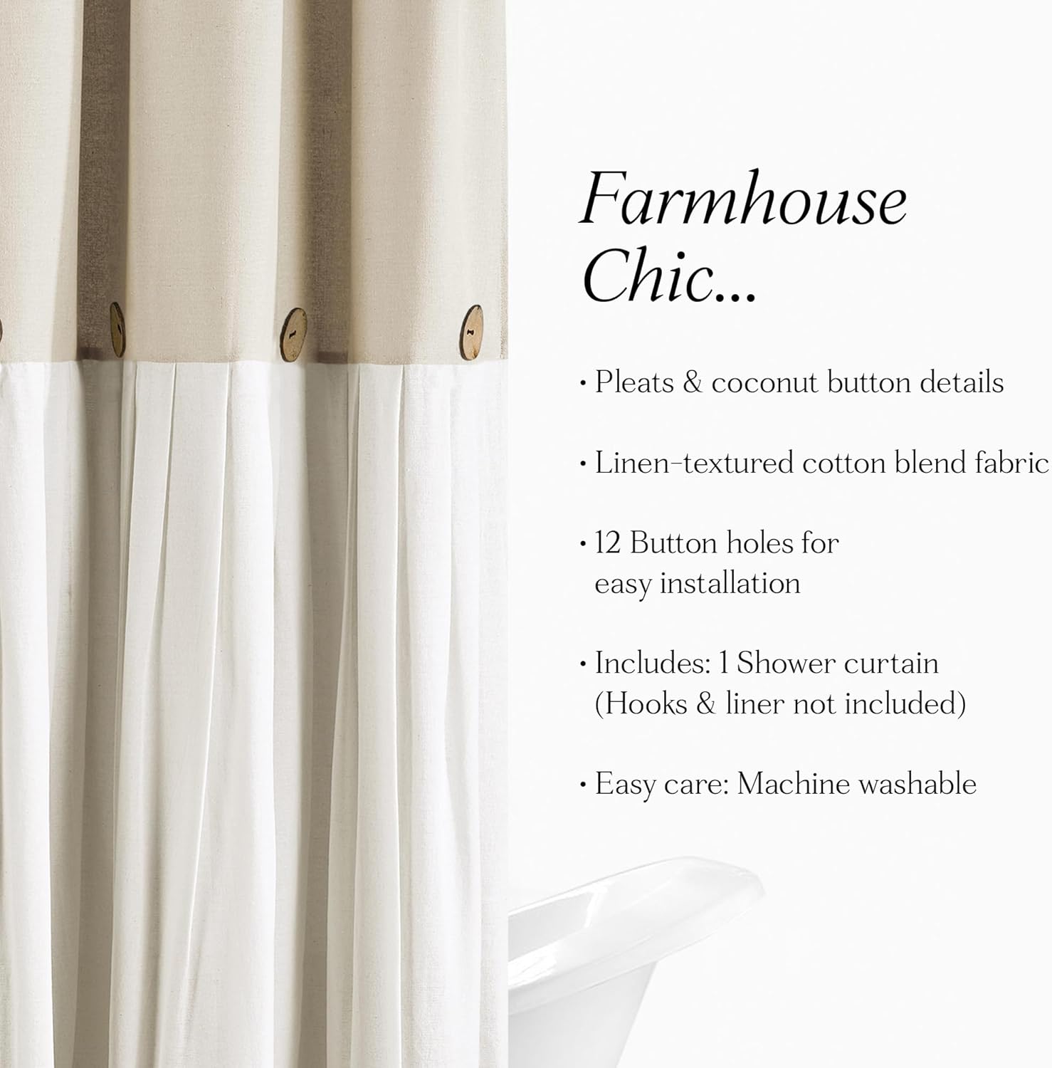 Add the look of linen to your to your home with the Linen Button Shower Curtain. Featuring a pleated color block design and coconut button details, this charming bath curtain adds style and texture to your home. This bathroom curtain is crafted from a linen-textured cotton fabric blend of 52% Polyester, 37% Cotton, and 8% Viscose. The coconut husk button details add a handcrafted, rustic feel your space. These fabric shower curtains for bathroom are the perfect addition to your modern farmhouse, country, or coastal styled bathroom. Sold as a single bath curtain, this extra long shower curtain measures 72" W x 78" L. The 12 button holes at the top of this shower curtain make it easy to hang with hooks or rings, ensuring a simple installation process. Because this is a fabric shower curtain, we recommend pairing it with a liner, sold separately. Caring for this cotton shower curtain is easy, simply machine wash cold on the gentle cycle, and tumble dry on low. If needed, use an iron on low heat to remove wrinkles or a non-chlorine bleach for cleaning.