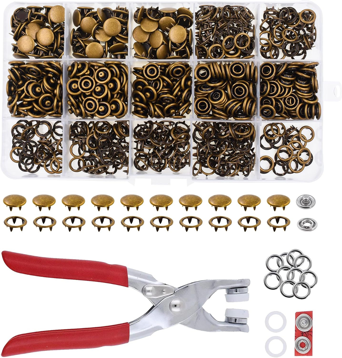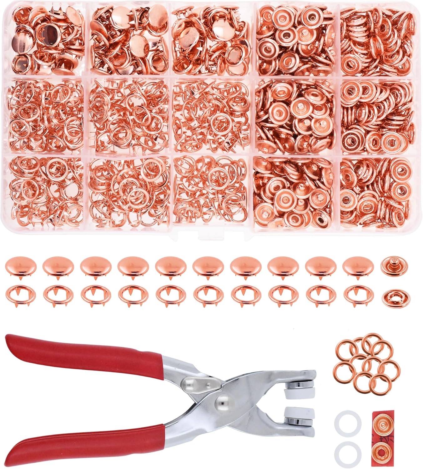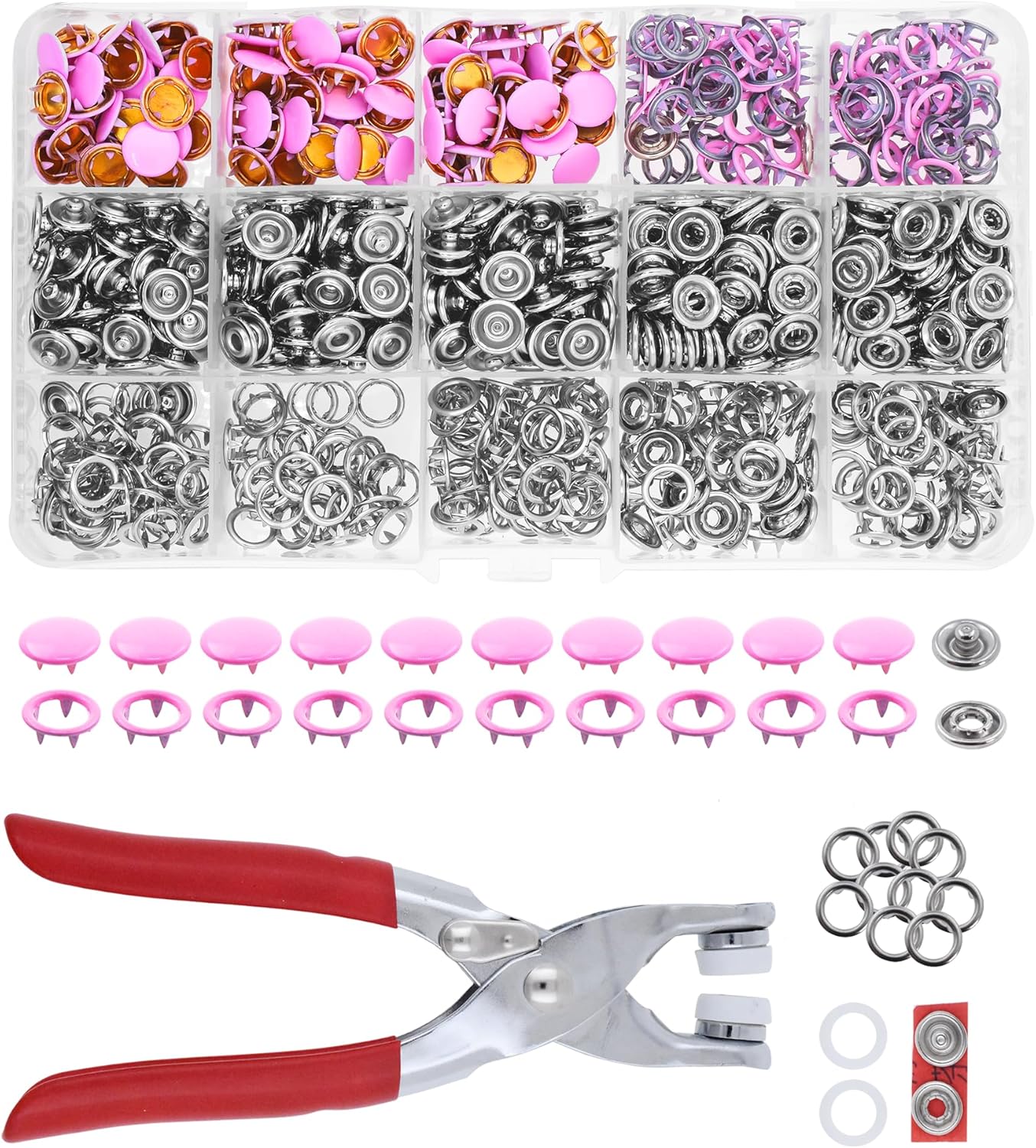 Are your plastic snap buttons constantly popping off? Do you have trouble attaching metal fasteners? This metal snaps and tool set is the answer. Compared to plastic snap fasteners, the heavy duty snaps provide more sturdy fastening. The snap repair set works with a snap machine and pliers though the included setting tool set is sufficient for quick installation. With a hammer and the included punch, setter, and anvil, you can add sewing fasteners to leather, corduroy, flannel, or silk like a breeze. After practicing on a piece of unwanted cloth first, you will be able to install a press on snap replacement in a heartbeat! The storage box keeps the assorted metal buttons snaps organized for easy picking. With plenty of quantity included, the metal snap set will last for several projects. Easier to apply than sewing on snaps, the metal snap on snaps are a must-have for repairing damaged or crimped snap closures. From attaching a hood to a jacket or replacing a coat zipper, these clothing snaps can do it all. The metal snaps for sewing are not only functional but also decorative for pants, western shirts, boots, cargo shorts, rompers, jumpers, coats, detachable badges, shoes, handbags, and belts. These fancy tiny snaps add a touch of fashion and can be attached to upholstery and soft furnishings around the home to create items like curtains, cushions, pillow cases, and chair covers. The uses of the colored button snap set are so versatile that it can even be used for card making.