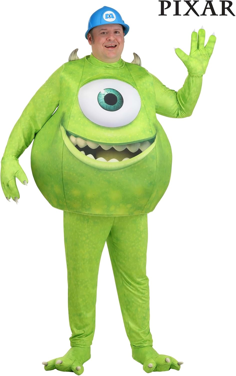 Modeled after the beloved character from Disney and Pixar's Monsters, Inc., this plus size costume makes sure to infuse fun and vibrancy into your party experience. Whether you're attending a Halloween celebration, hosting a themed birthday event, or gearing up for a movie night with friends, this deluxe costume is your ticket to standing out in style. The costume features a foam backed tunic that captures Mike Wazowski's round and lively appearance perfectly. With its giant stuffed eye and wide printed grin, you're set to become the life of the party, evoking laughs and admiration wherever you go. The tunic's soft fiber filled horns add an extra layer of character, giving you that authentic monster charm synonymous with Monsters, Inc. Dressed head to toe in vibrant green, this ensemble includes a snug and stretchy spandex base layer, ensuring you can dance, celebrate, or collect candy comfortably without restriction. The outfit’s fitted design not only provides ease of movement but also keeps the rich green hue consistent and eye catching. The four way stretch spandex in both the pullover top and pants caters to easy mobility, making this costume as practical as it is playful. Accessorized with matching gloves and shoe covers, the costume maintains its seamless color scheme. The shoe covers are cleverly designed with foam and jersey knit fabric, complete with elastic ankles and fiber filled toe caps to maintain that iconic Mike look. Secure them in place with elastic bands underfoot and fasteners at the ankles, ensuring a comfortable and stable fit as you trek from one event to the next. The ensemble is completed with a fully styled Monsters, Inc. hard hat, exclusive to the set, enhancing the authentic feel of the costume. With its simple back fasten system, this costume is easy to put on or remove, making transitions between party events hassle free. It's perfect not only for Halloween but also for costume parties, themed events, comic conventions, and charact