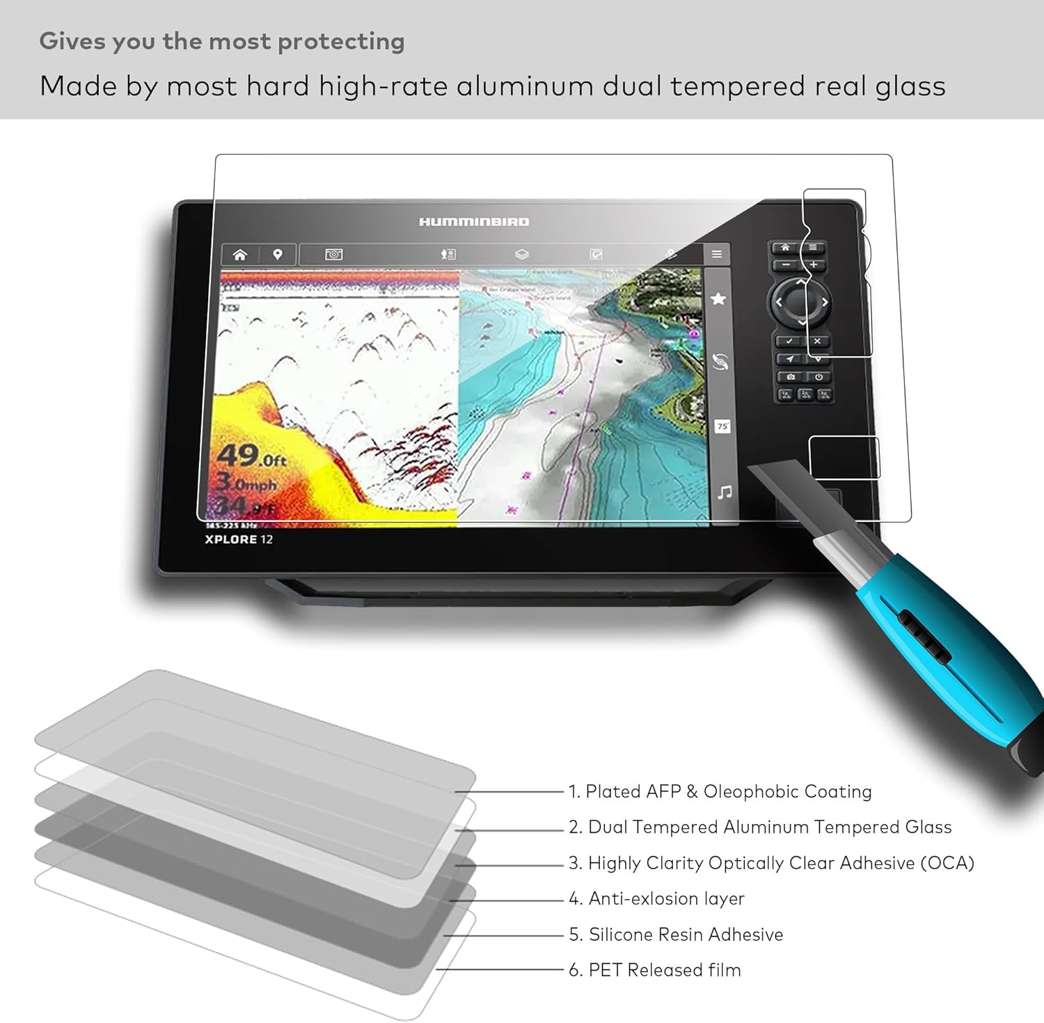 This screen protector was designed for the 12 Inch touchscreen of: for Humminbird Xplore 12 Package Includes: 1* 12.1" HD Clear glass screen protector 1* Installation Accessories