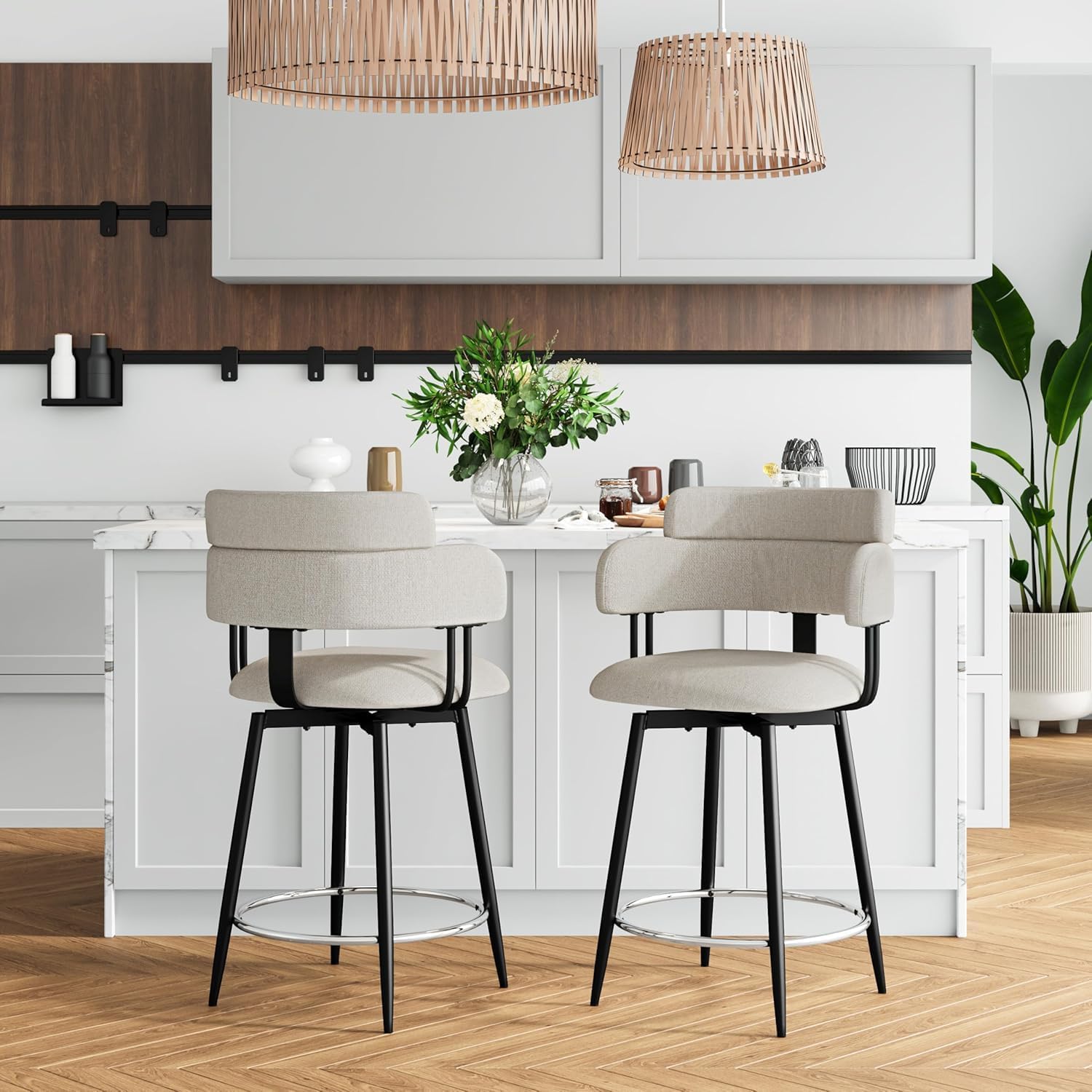 Set of 2 Swivel Bar Stools – 30" Seat Height, Upholstered Linen with Ergonomic Backrest and Chrome Metal Legs – Perfect for Kitchen Islands or Dining Rooms