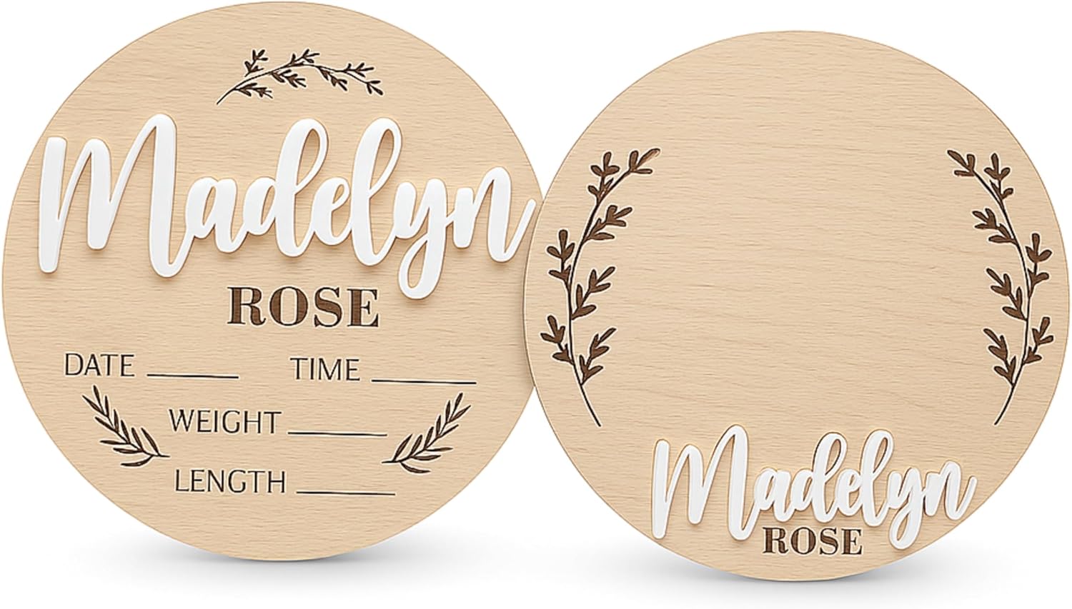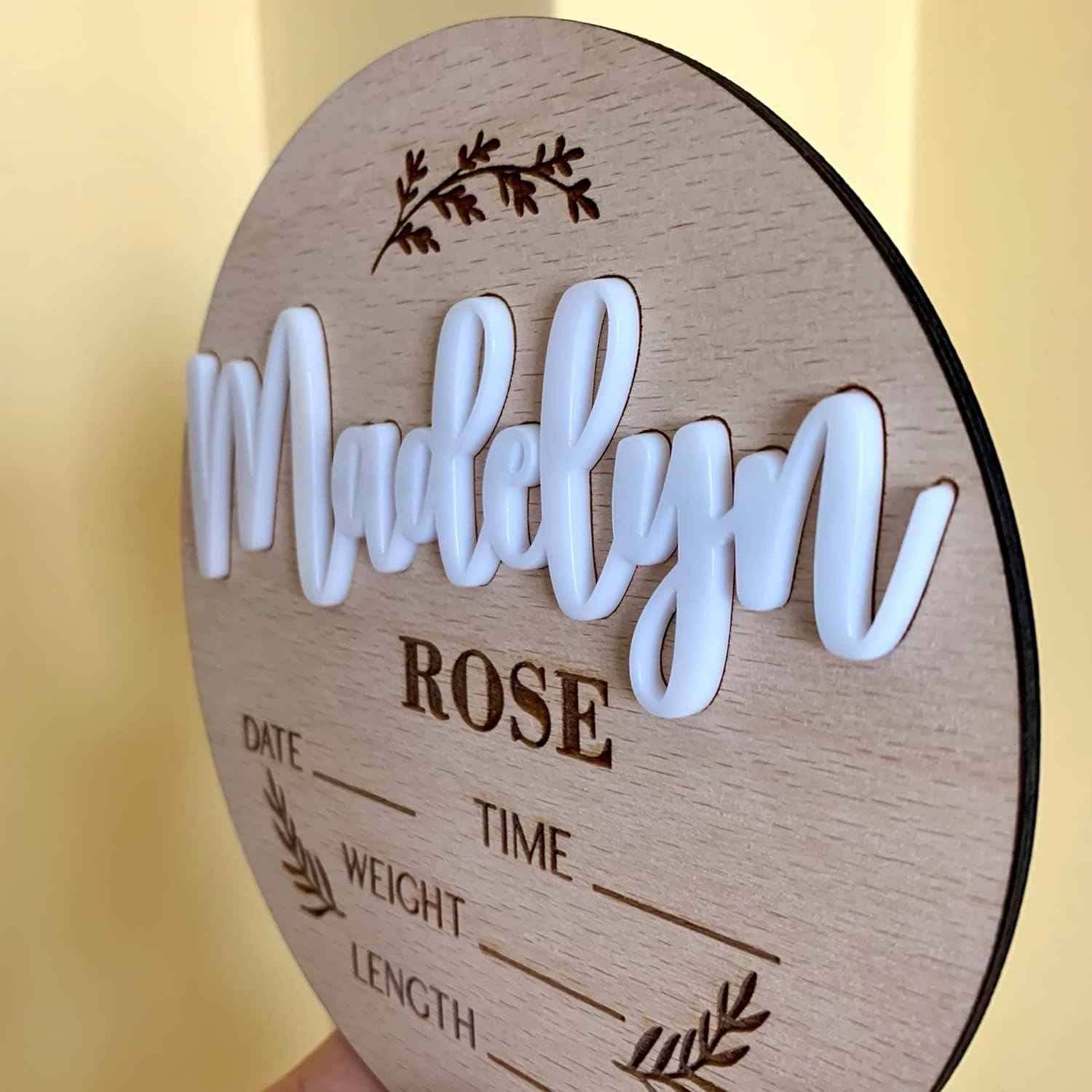 These beautiful signs are made of wood material at the back and color cutout in front. The text in the front cutout is 1/8 thick, which creates the illusion of a 3D effect. The letters cutout in front can be any color from our color palette. ( see picture #2) The size used in the first image "Madelyn Rose" is 6 inches There will be no footprints on the footprint sign, your baby will need to print it. These beautiful handmade baby signs are great items to add to your nursery decor or a thoughtful gift for someone with a baby. Including a custom name (first name and middle name), birth statistics, and a blank space to add your baby's footprints. Contact me if you would like to change anything. This sign has a 3D custom name. Color of the first name in front: (picture #2) Perfect for birth announcements and photo props. Our sign is a perfect keepsake to commemorate your baby's birth and is customizable to include all the important details. We have 4 size options. (diameter) - 6 inches - 8 inches - 10 inches - 12 inches Custom orders are welcome. We can produce this baby sign in 1-2 days after your order.