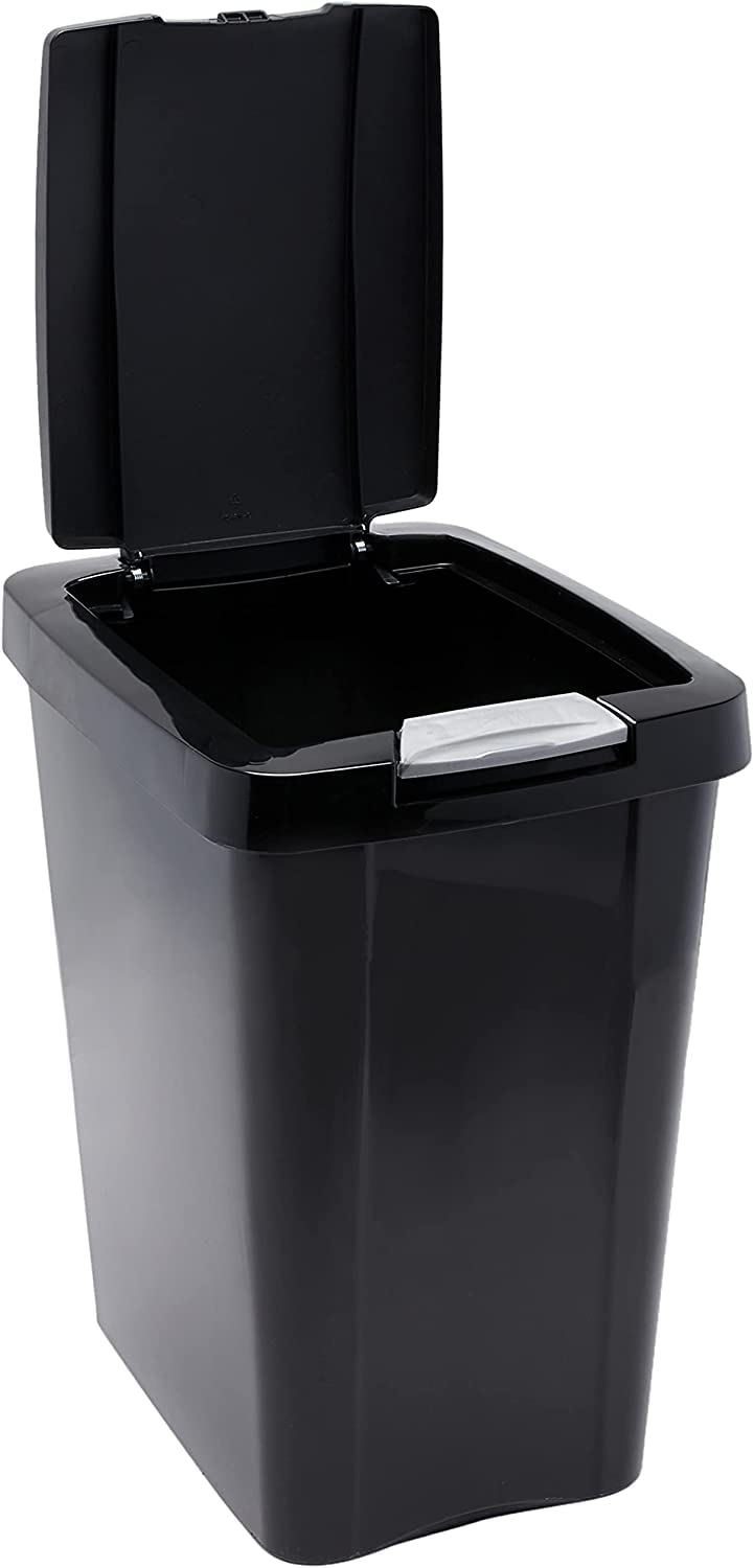 The Sterilite 7.5 Gallon TouchTop Wastebasket features a sleek profile and a smooth-textured surface. The slim shape is designed to fit into narrow spaces and the lid orientation features the latch on the short end of the rectangular base. TouchTop lid opens with a touch then shuts securely to keep contents concealed and smells contained. The TouchTop Wastebasket fits a standard 8 gallon trash liner, or it can be used as a recycling bin. This Wastebasket is ideal for all areas of the home including bathroom, bedroom, mudroom, office and even the kitchen.