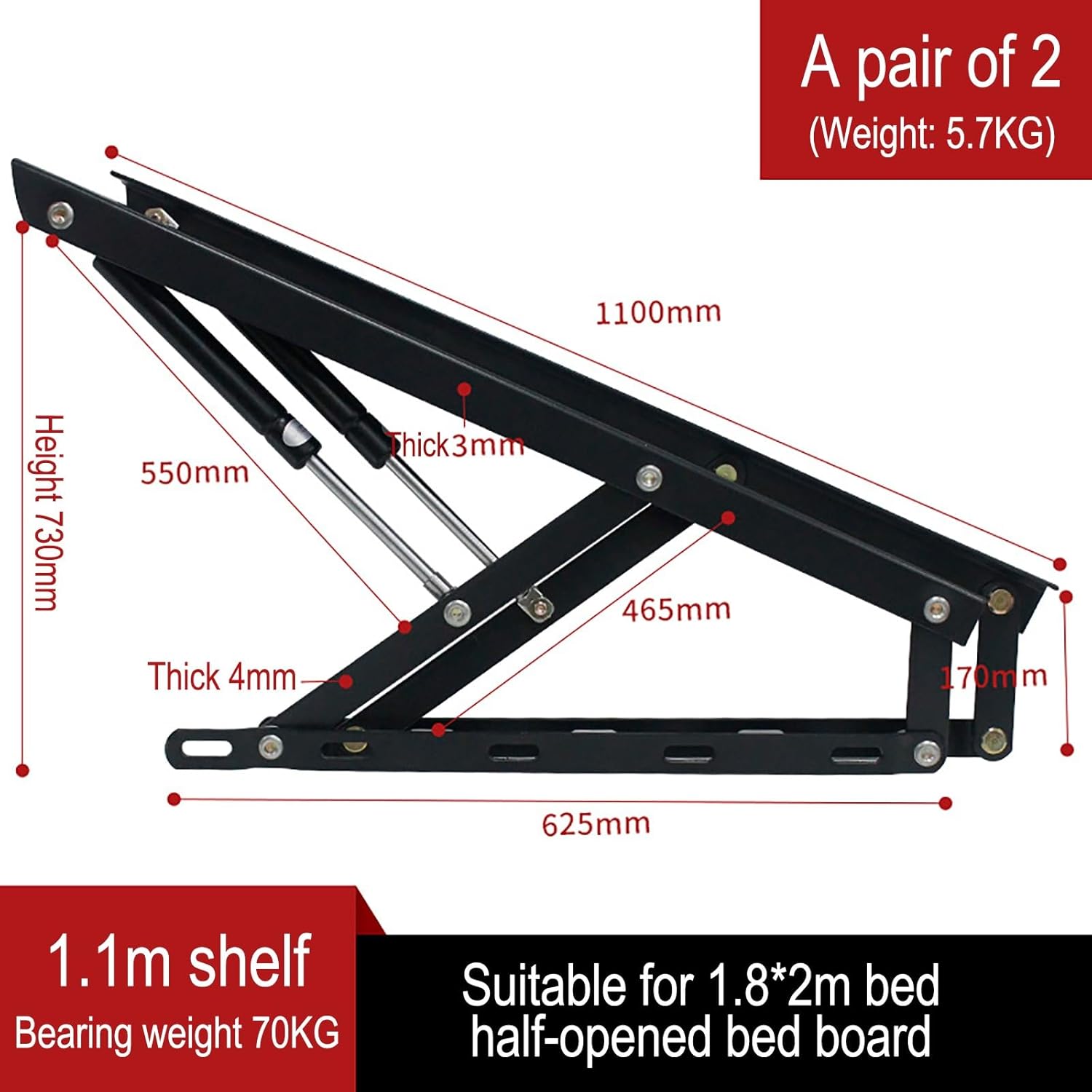 Specifications: Material: Cold rolled steel Color: Black Available Sizes: 610mm, 750mm, 900mm, 1100mm, 1200mm, 1500mm Load Capacity: 22kg, 40kg, 60kg, 70kg, 100kg Product Weight: 3.2kg, 3.5kg, 5kg, 5.7kg, 5.8kg, 6.5kg Key Features: Smooth opening/closing buffer system Effortless and space-saving operation Suitable for double, queen, and king size beds Package Includes: 2 x lift mechanisms All necessary mounting hardware Note: 1.Slight 1-2cm size variation may occur due to manual measurement 2.Minimal color differences may exist due to monitor/screen settings 3.Actual product may vary slightly from images