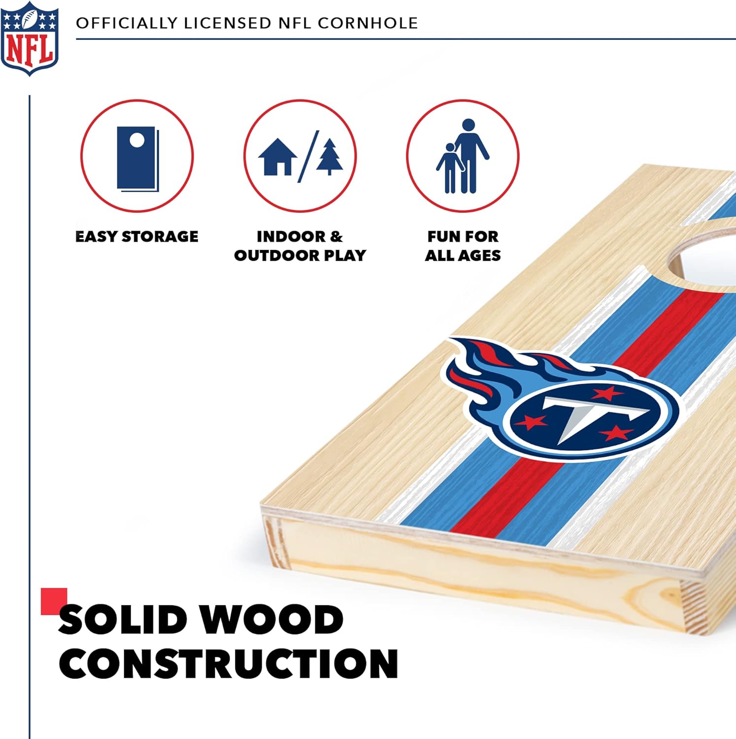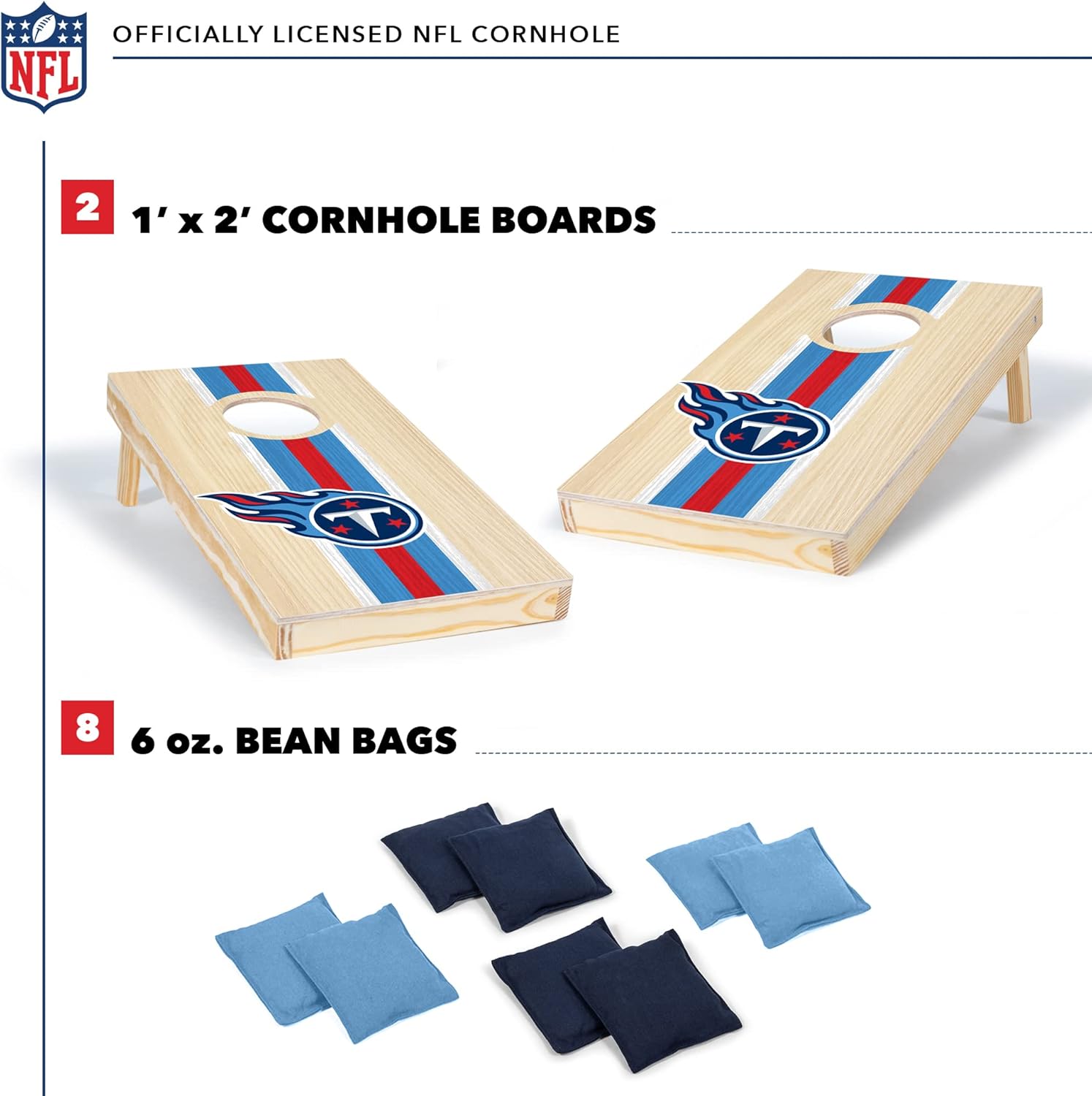 Officially licensed NFL cornhole boards are a tailgating staple and this 1' x 2' travel cornhole set is ready to pack up and play anywhere! This cornhole set is small but mighty, and when it comes to features, this bean bag toss set packs a serious punch. NFL team graphics are directly printed in digital high definition onto the board's surface so they won't peel or fade over time like vinyl stickers and the natural wood texture provides the perfect amount of "slide". The furniture-quality wood construction is built to last for years. The set includes (8) 4" x 4", 8 oz. high-quality dual-sided stick-and-slide bean bags that just feel right in your hand. Bean bags have and one textured side to stick it on for 1 point and one duck cloth side to slide it in for 3 points. This cornhole set is the ideal travel size and can be easily packed in the trunk along with the rest of the tailgate gear. It's easy to carry and store - a perfect way to show off your team pride and liven up the party. Take home an NFL cornhole game set and hone your skills toward greatness while defending your team's honor.